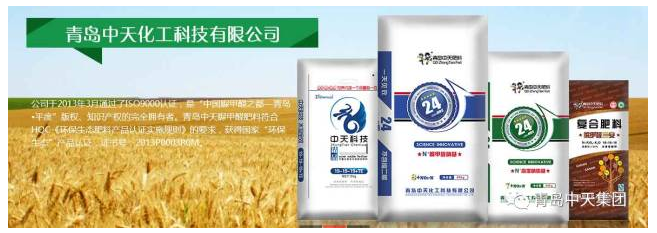 具有自主知識產權、綠色環保、世界領先的青島中天脲甲醛緩釋肥生產技術,將尿素與脲甲醛在特定的條件下,發生縮合反應,產生速效、中效、長效成分,逐級釋放,延長養分釋放時間,提高了肥料的利用率。獲得國家專利,專利號:ZL200920270334.5。